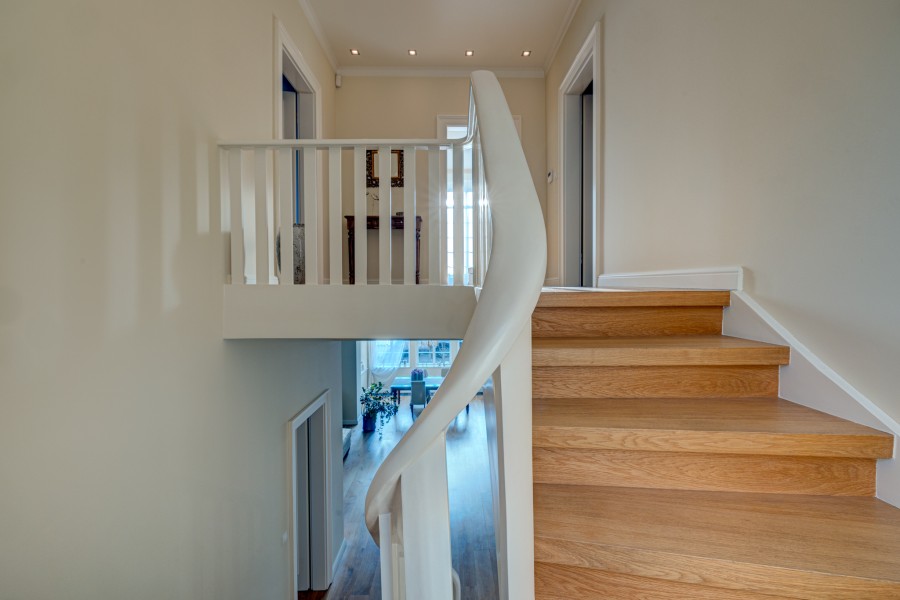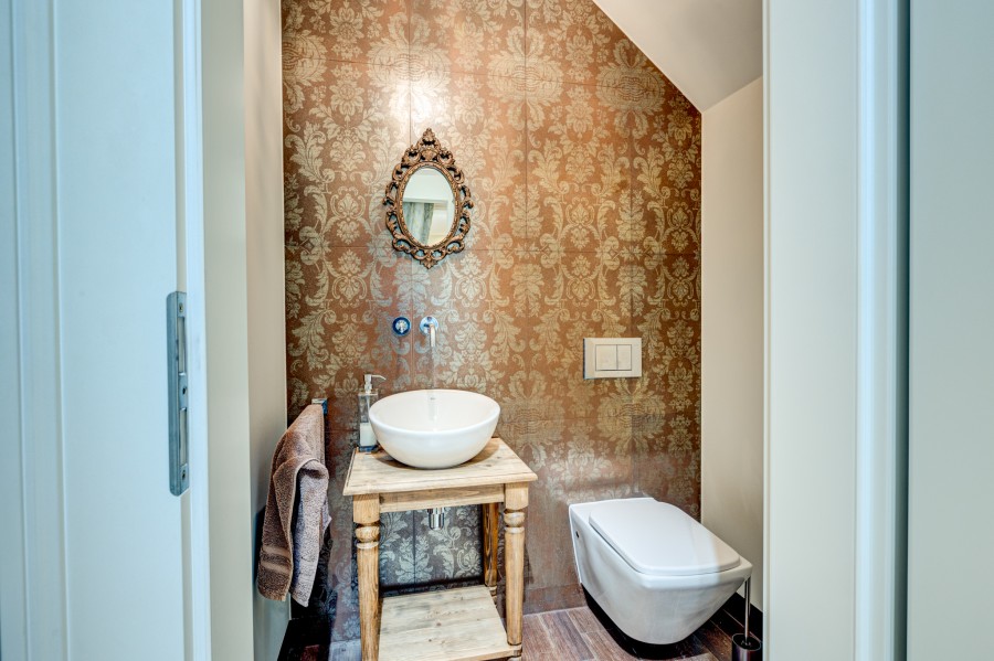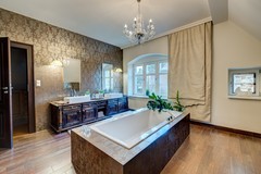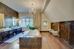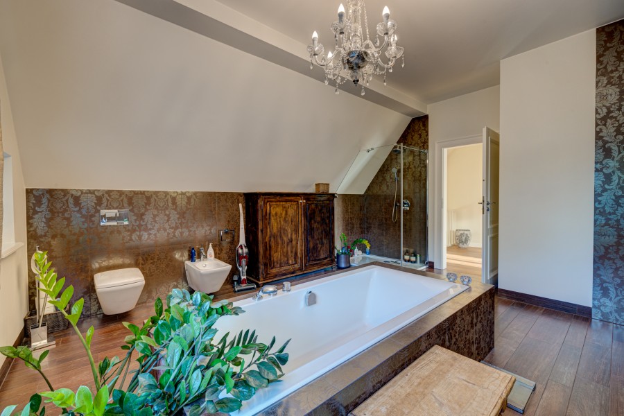 Na I piętro prowadzą wygodne, szerokie, dębowe, olejowane schody. Poddasze użytkowe o łącznej powierzchni 80,34m2, powiększone dodatkowo o 10,70m2 antresoli nad jednym z pokojów. Drugi pokój to jasna słoneczna sypialnia z garderobą i z wyjściem na spory taras. Natomiast punktem kulminacyjnym tego poziomu jest niewątpliwie łazienka, przepraszam, pokój kąpielowy, z wanną na samym środku, wygodnymi dwiema umywalkami, kabiną prysznicową i bidetem. Całość stylowo wykończona, a ogrzewanie podłogowe zapewni jeszcze lepszy nastrój. Niewątpliwym plusem jest fakt, że klimatyzacja została zaprojektowana i rozprowadzona już na etapie budowy, w pomieszczeniach zamontowano osobne klimatyzatory, a jednostka centralna znajduje się w zabudowie w ogrodzie. Kolejnym atutem jest rozprowadzenie instalacji alarmowej, teletechnicznej (videodomofon) oraz zamontowanie kamer.