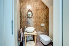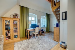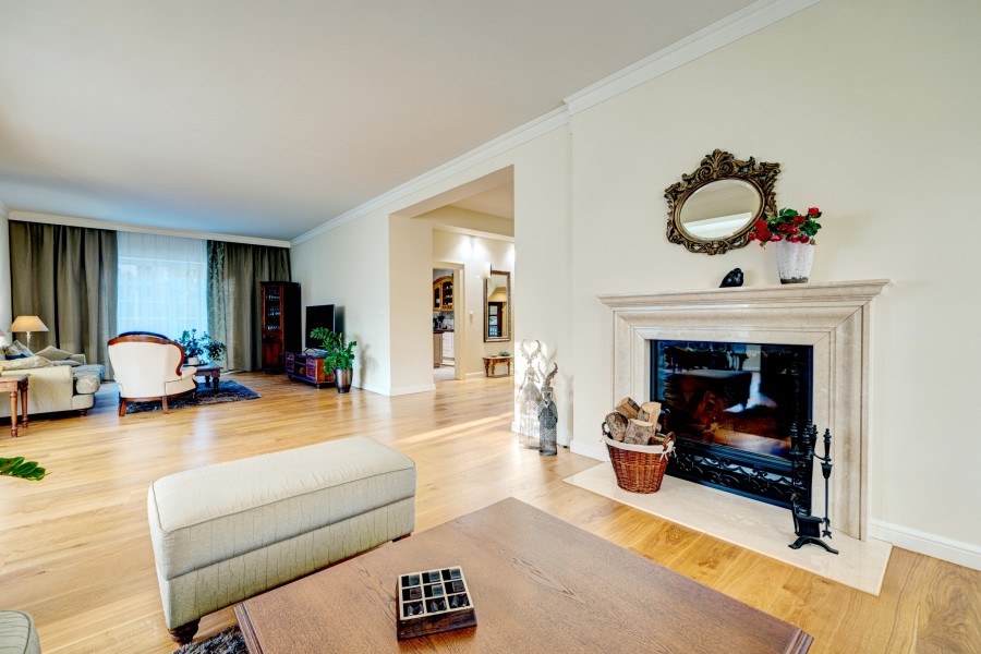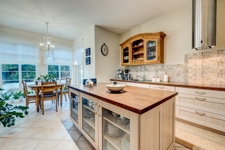 Wchodząc na posesję widzimy nowe ogrodzenie stylizowane na stary styl. Furtka oraz brama wjazdowe otwierane automatycznie. Uwagę mogą przykuć srebrne kółeczka na ceramicznych mrozoodpornych płytkach, które odpowiadają za podgrzanie chodnika. Przechodząc kilka schodków otwieramy zewnętrzne drzwi wejściowe - drewniane częściowo przeszklone i antywłamaniowe. Znajdujemy się w hollu, z którego możemy zejść do piwnicy, albo pozostać na tym poziomie. PARTER to nietuzinkowa przestrzeń - część dzienna o łącznej powierzchni 134,67m2. Na szczególną uwagę zasługuje słoneczny salon z urokliwym wykuszem i z ozdobnym kominkiem (z płaszczem) o wielkości standardowego mieszkania 3 pokojowego (!) tak, to nie pomyłka. Przestronny salon to 68,06m2 przestrzeni do relaksu i odpoczynku. Przestrzeń połączona z kwintesencją elegancji i stylu - meble tworzone specjalnie na zamówienie ze starego drewna, woskowane. W tym miejscu zachęcam spojrzeć na podłogę w salonie, gabinecie i pokojach na piętrze położony jest drewniany parkiet FINISH, olejowany. 2 lata temu podłoga została odświeżona - umyta specjalnym środkiem, wycyklinowana i ponownie olejowana. Kuchnia w pełni wyposażona w sprzęt AGD, z drewnianymi meblami na wymiar z wyspą w centralnej części oraz klimatyczną jadalnią, z której rozpościera się piękny widok na taras i bajeczny ogród - zachwyci niejedną Osobę lubiącą spędzać czas przygotowując posiłki dla Bliskich. Na tym poziomie znajduje się również gabinet oraz wc.